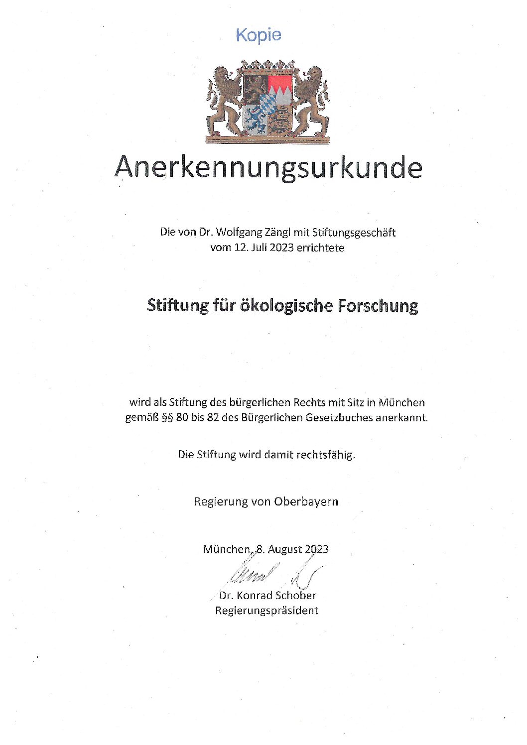 Die Stiftung für ökologische Forschung wird als Stiftung des bürgerlichen Rechts mit Sitz in München gemäß §§ 80 bis 82 des Bürgerlichen Gesetzbuches durch die Regierung von Oberbayern anerkannt und wird damit rechtsfähig.